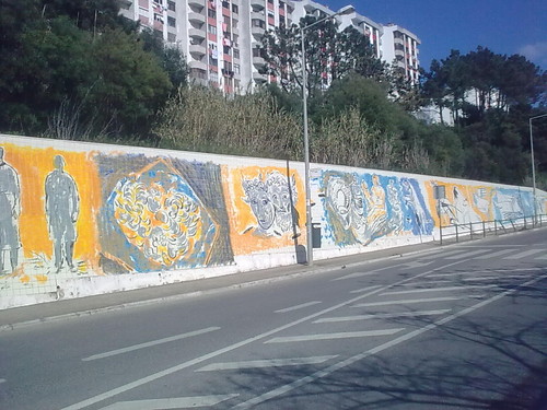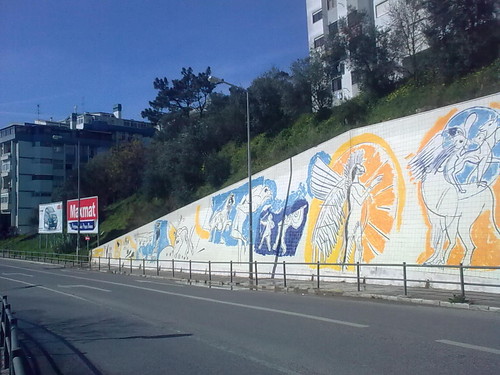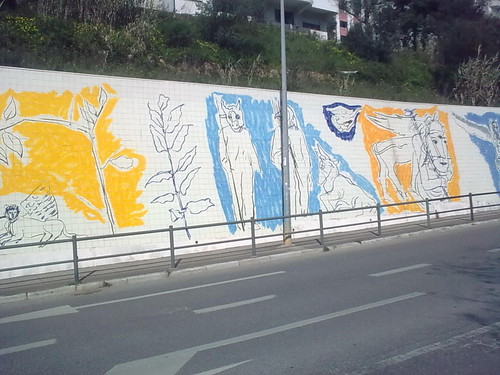 a rodear um muro forrado de azulejo e não uma criação artística! Esta panóplia de obstáculos impede visualizar na sua plenitude, a composição pictória de cunho mágico e esplendorosamente solar, que Graça Morais criou...É uma dor de alma.